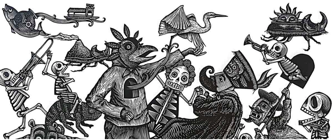 Para el oriundo de la Ciudad de México, las tradiciones, el gozo, la vida, la muerte y el afecto se entrelazan con el claroscuro de sus trazos.